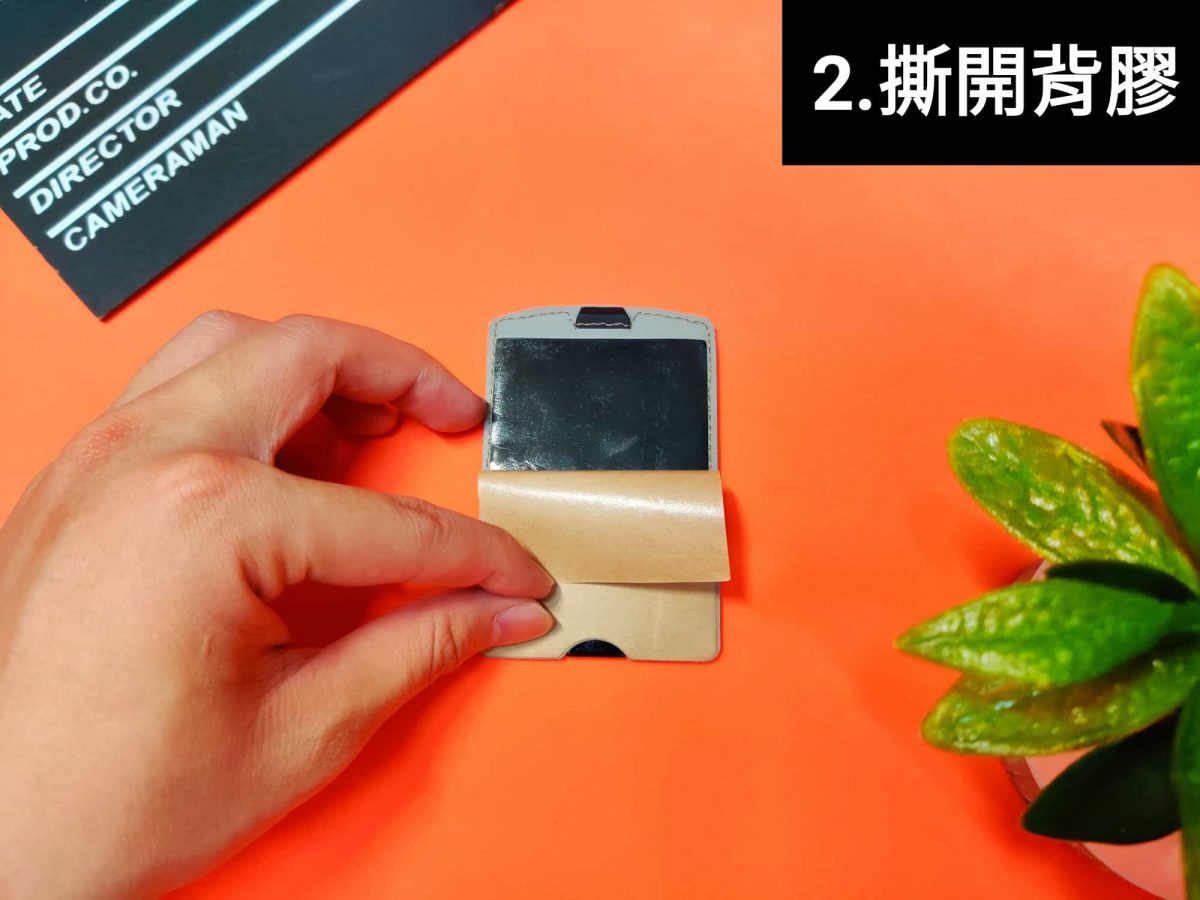 POCKETIN 安裝第一步必須先清潔黏貼部位,確保卸除時背膠上不會沾黏過多灰塵而導致黏性降低。第二步是必須將原先背膠上的貼紙撕掉;最後則是將 POCKETIN 黏貼在手機適當的位置。(建議按照手掌大小與常握持位置調整)