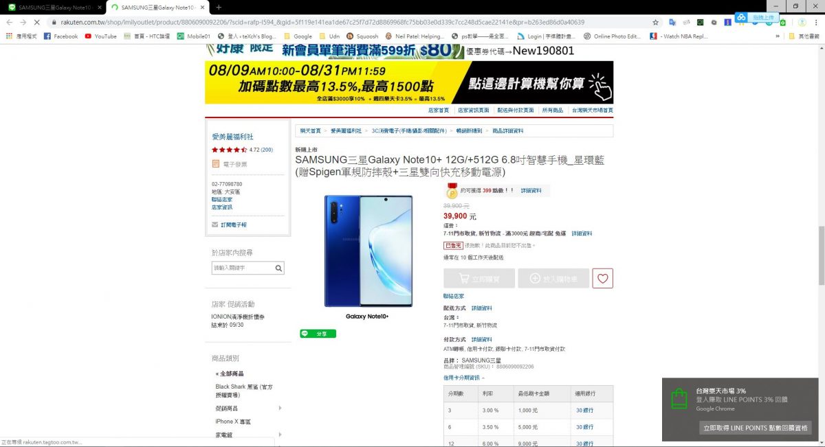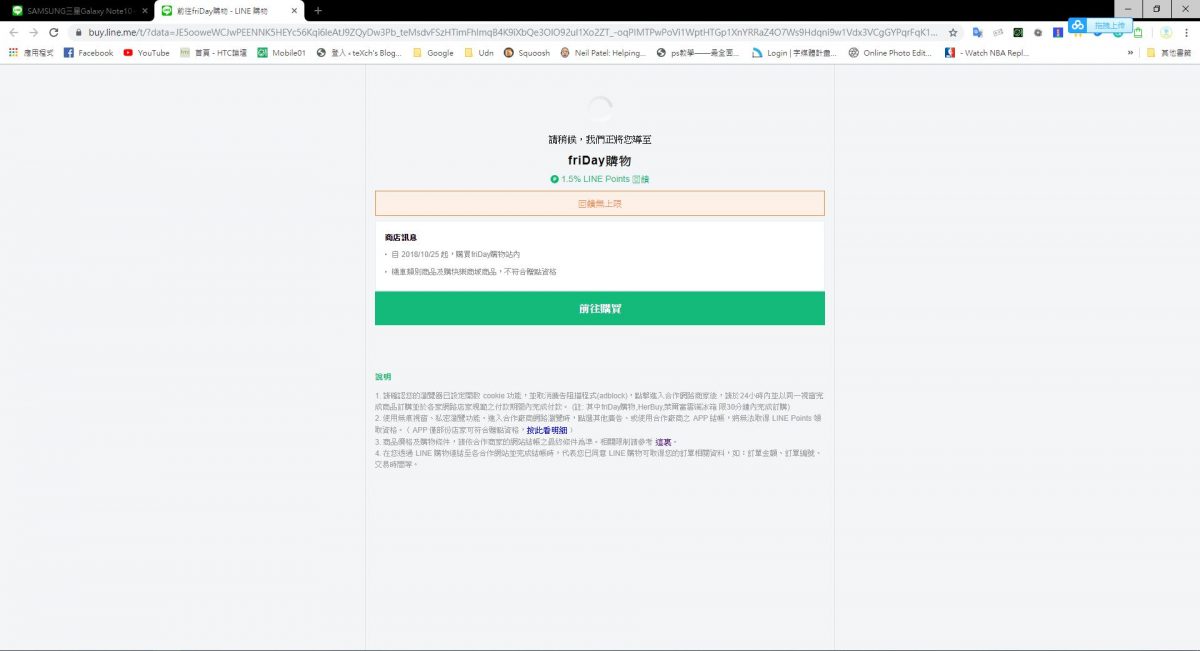 在搜尋比價中輸入想購買的產品( 以 Note10 為例 ),找到最低價格且最高 Line Point 點數回饋的選項,點開該連結時右下方會出現立即取得 Line Point 點數回饋資格,此時只要取得資格後並完成購買就可以得到回饋。