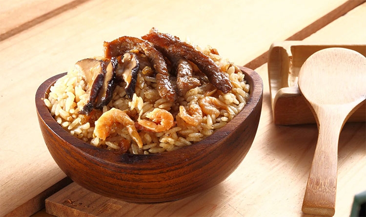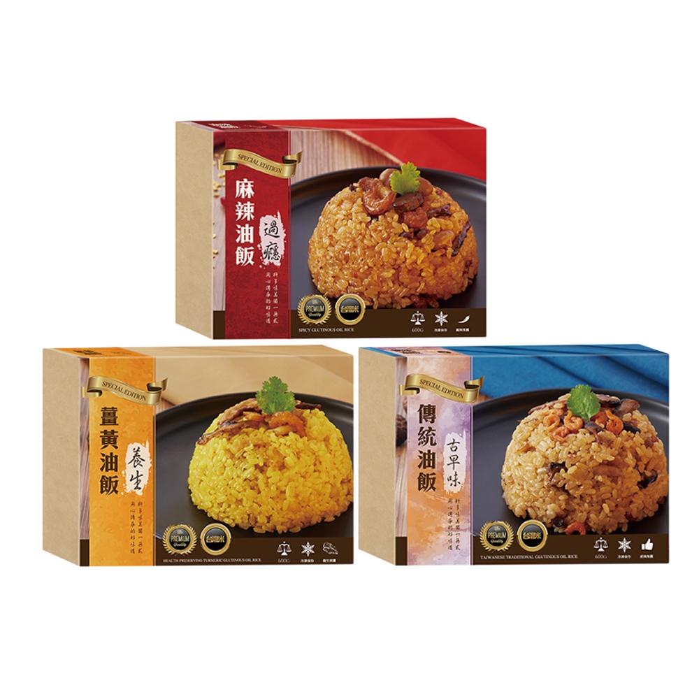 使用古法炊蒸而成的糯米油飯,除了一般原味,還有搭配薑黃粉以及台灣豬肉的獨特養生薑黃油飯,並加入一些蝦米作為點綴,讓整體的口感還有色調都與一般的油飯不同。甚至還有麻辣口味,讓喜歡吃辣的人不必額外添加辣醬就可以品嘗到辣味的油飯。