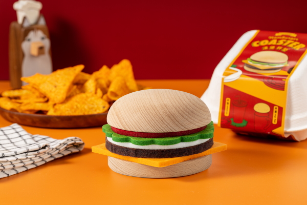 豪華漢堡新鮮出爐囉!木匠漢堡杯墊杯蓋組,除了上下木頭材質的實木漢堡皮可以作為杯蓋,輕鬆隔絕灰塵。漢堡裡面還夾著層層美味,包含了番茄、蔬菜、蛋白、起司和肉片,餡料部分採用毛氈設計,是方便快速吸水的杯墊。獨一無二的創意設計,無論送禮或自用都很吸引人~