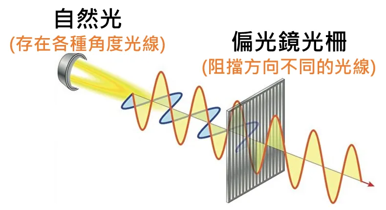 以前物理學過,光線是一種電磁波。光行進時,電磁場的振動方向會朝向四面八方過來。若某種光行進時,其電磁場的振動方向都在同一方向時,此種光稱為「偏振光」,而此種光具有偏振性,想更進一步瞭解的可以到下面文章看看。