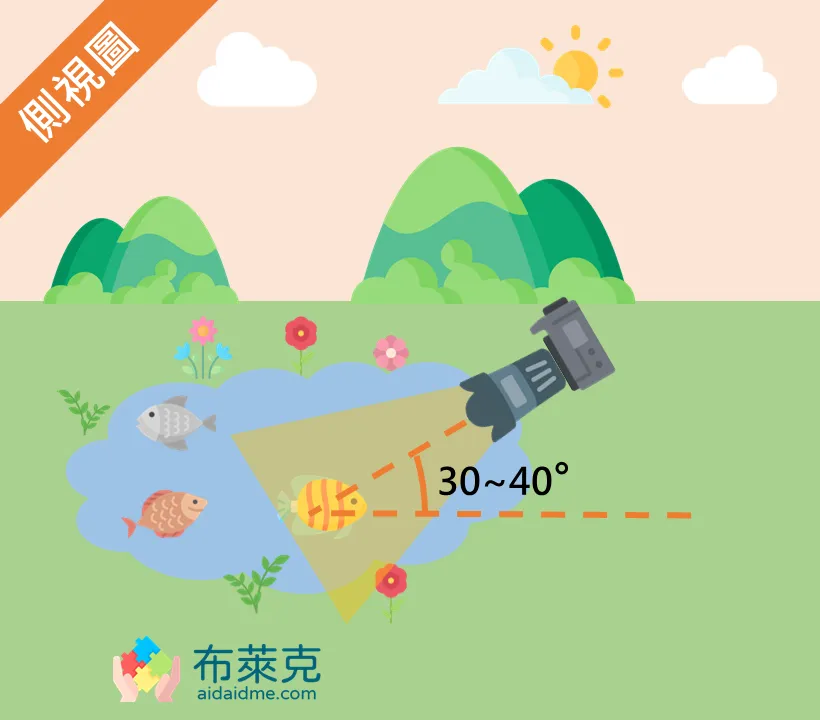 各位可能有個疑問「怎麼知道角度是多少?」,其實這只是一個經驗法則。實際拍攝當然不可能拿量角器來測量,測完魚也不見了。