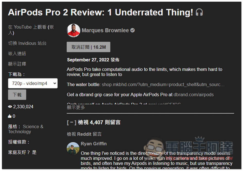 像我找知名科技 YouTuber,MKBHD 頻道就有,目前最新影片是 AirPods Pro Review 這一個: