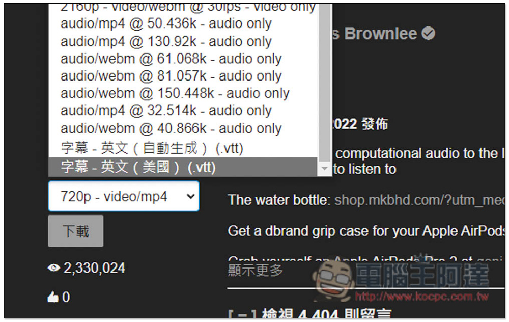 影片、音樂都能下載,影片和音樂都只有提供 MP4 和 WEBM,因此如果你想要 MP3 音樂,需要使用其他轉檔工具來轉。含聲音的影片解析度最高只到 720p,這點比較可惜,想要有更高畫質的話,必須透過合併檔案的軟體,像是下載 2160p 影片和純聲音,再手動併起來。按下方按鈕就會開始下載: