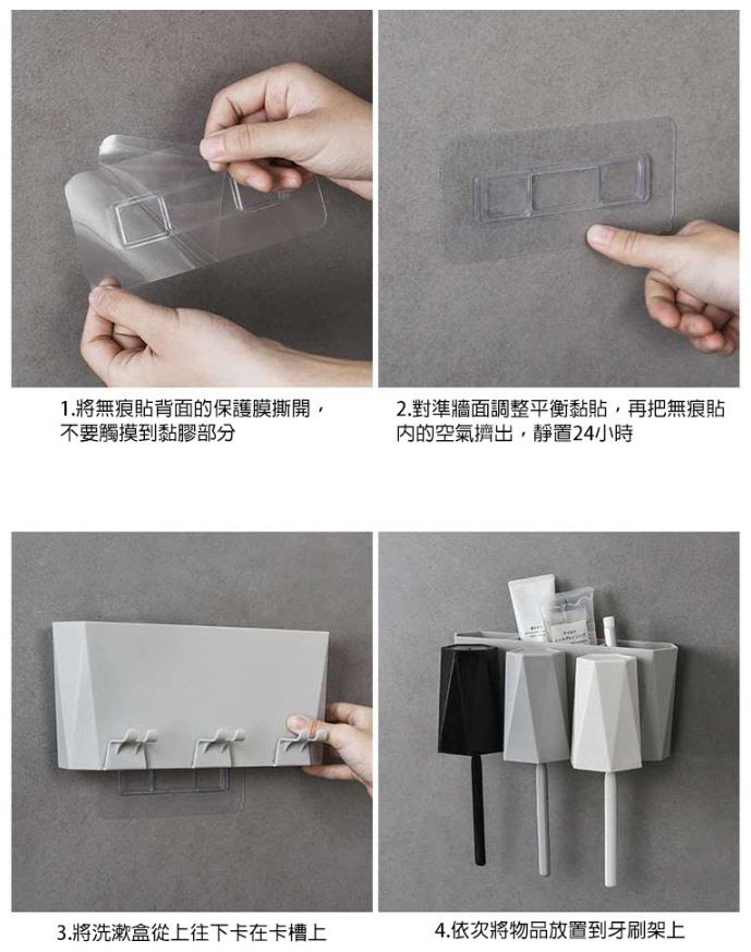▲安裝方式很簡單,將牆面清潔乾淨後貼上無痕貼紙,擠壓出空氣後,放置24小時,接著將洗漱盒卡上三個牙刷架,由上而下卡進卡槽,就完成囉!