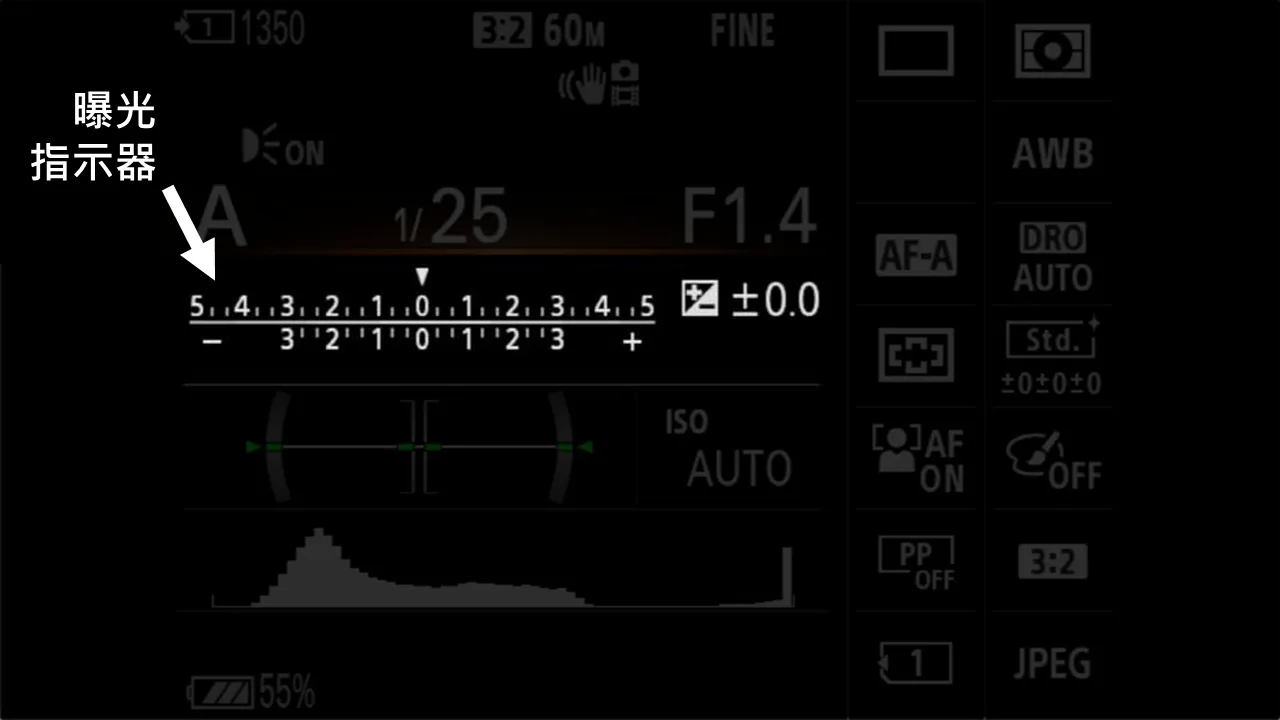 如果在室外的話,只要光線充足,那還是盡量調降感光度 ISO,才會降低雜訊。如果你不知道怎麼判斷相機內的明暗程度,你可以從相機內的曝光指示器 (又稱測光表) 來判斷。要獲得最正常的明暗程度,那就盡量讓下圖的刻度留在 0 的位置。