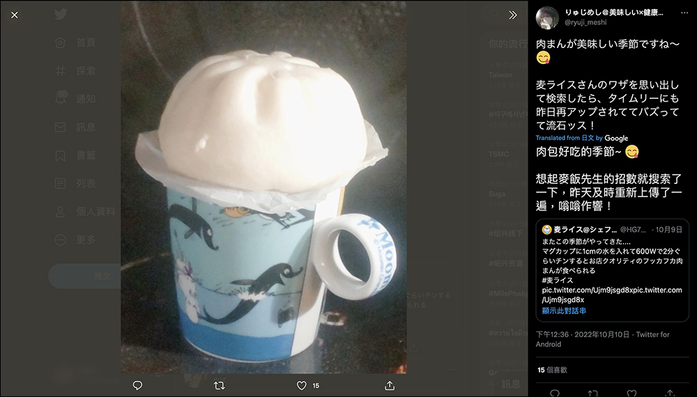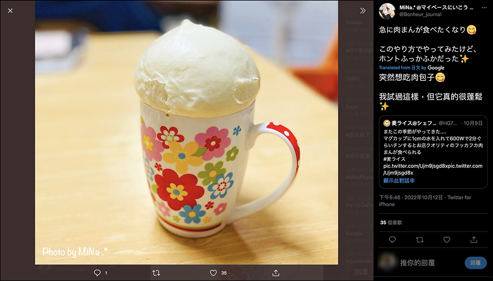 也有網友分享使用微波爐加熱放在馬克杯上的包子這招,表示加熱的包子真的鬆軟不黏膩,雖然吃起來還是小小輸給蒸籠,但已經相當不錯。