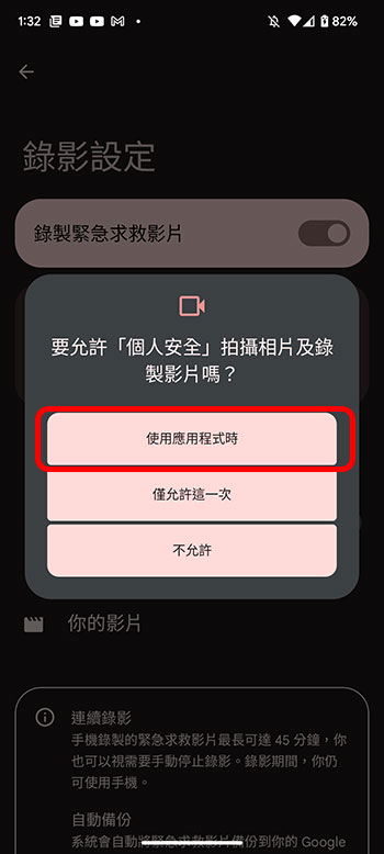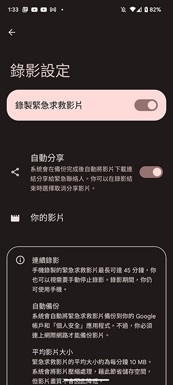 - 將「錄製緊急求救影片」的開關打開,並且將下方的「自動分享」也打開才能進行自動備份與分享給緊急聯絡人。