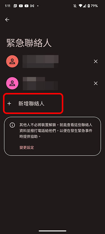 - 點擊「新增聯絡人」,然後從通訊錄清單中選擇要加入的人員。如果你想設定的人物並不在通訊錄中,請先把他添加到通訊錄才能設定成緊急聯絡人。