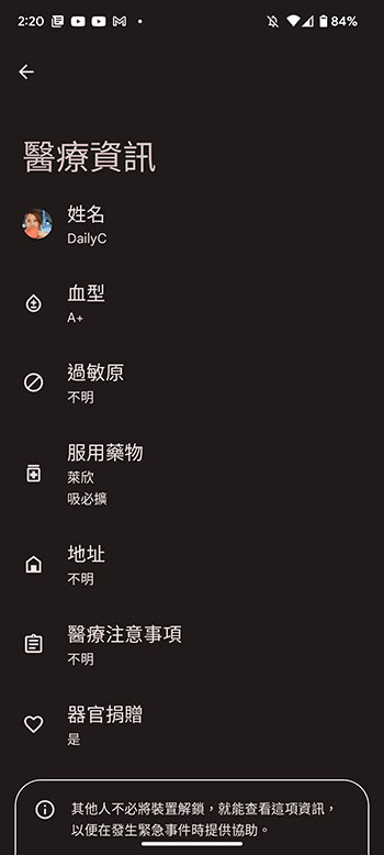- 在這一頁裡面,你可以點擊每一項去設定更多個人醫療所需資訊。這些資訊只會儲存在手機本身,並不會與其他人共享或傳遞到雲端與遠端伺服器,因此可以安心使用。