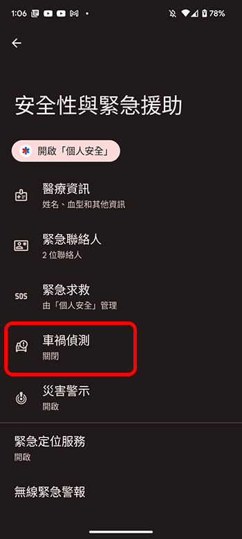 - 在「安全性與緊急援助」中點擊進入「車禍偵測」。