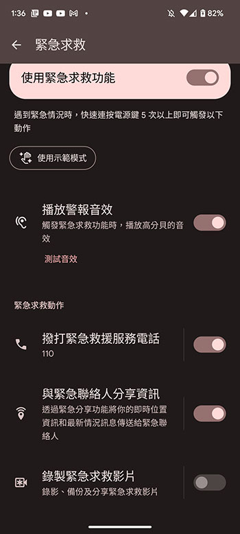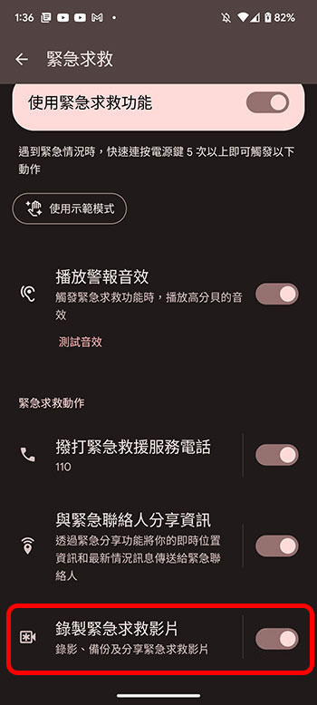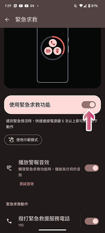 - 將「使用緊急求救功能」的開關打開。未來當你遇到緊急情況時,只要快速連按 5 次以上的電源鍵,就能觸發下一步驟中你選定的動作。