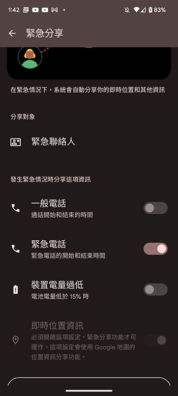 - 接下來,你可以選擇想要分享的資訊,包含一般電話、緊急電話、裝置電量過低與即時位置資訊等。