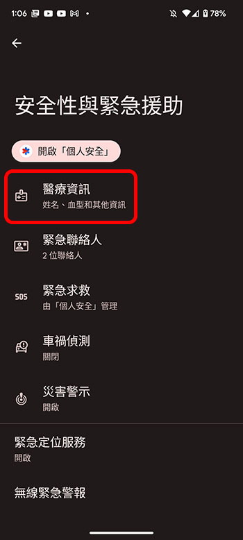 Android 中另外還提供了其他進階設定功能來提高安全性,這些功能的設定同樣位於「設定 >> 安全性與緊急援助」,可以獨立於緊急救援之外運作。你還可以將個人的血型、過敏史與用藥等醫療資訊輸入其中,以便醫療人員在救援時可以從鎖定畫面查看這些重要資訊。