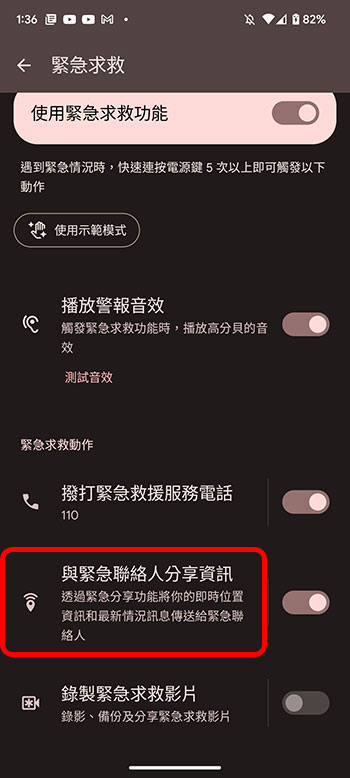 - 在「緊急求救」功能表中點擊「與緊急聯絡人分享資訊」,並且開始設定。