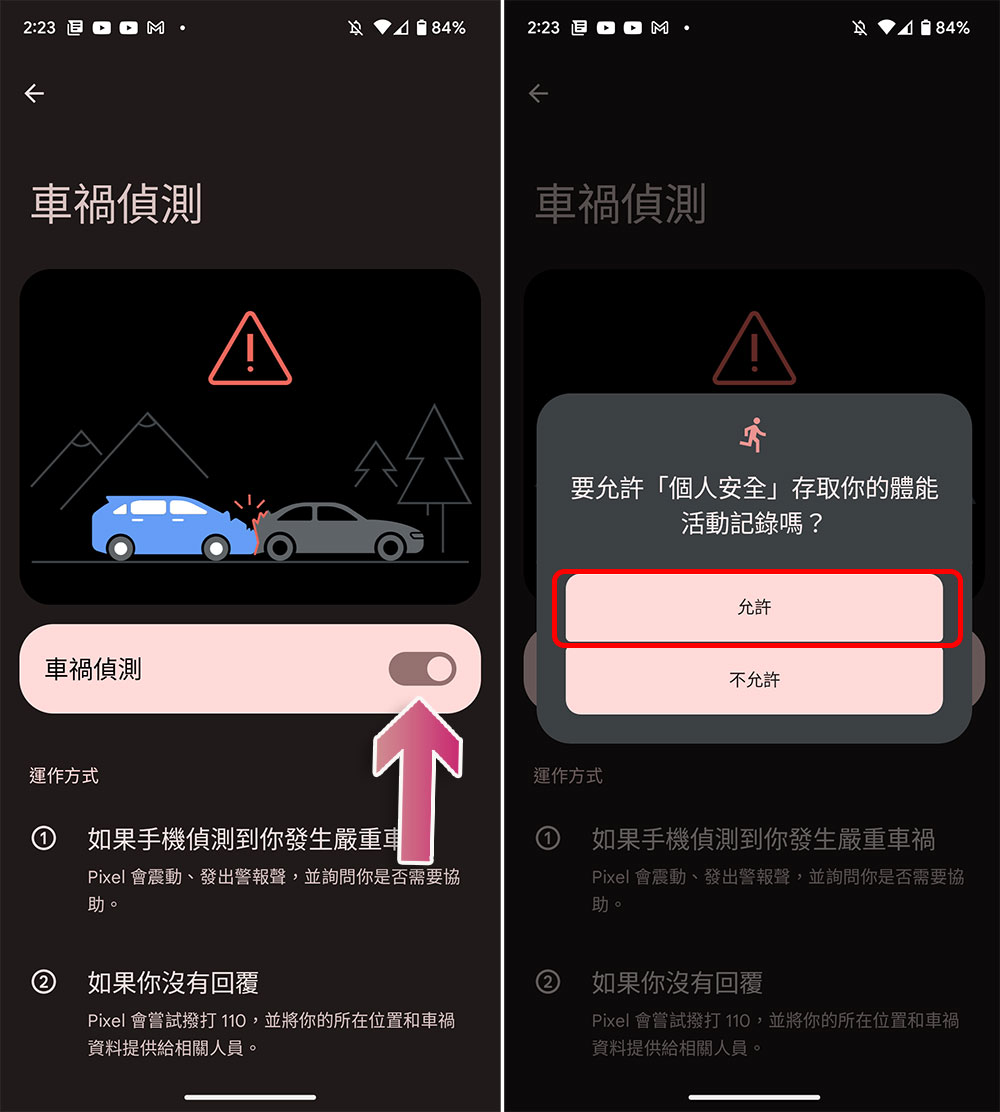 - 將「車禍偵測」的開關打開,此時系統會詢問你是否給予存取體能活動紀錄的權限,請選擇「允許」。另外,你還要授予「個人安全」位置訪問的權限,這時請選擇「使用應用程式時」。