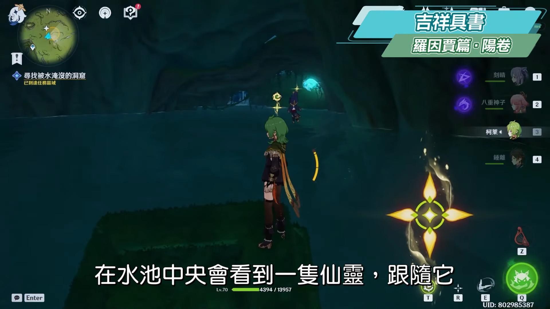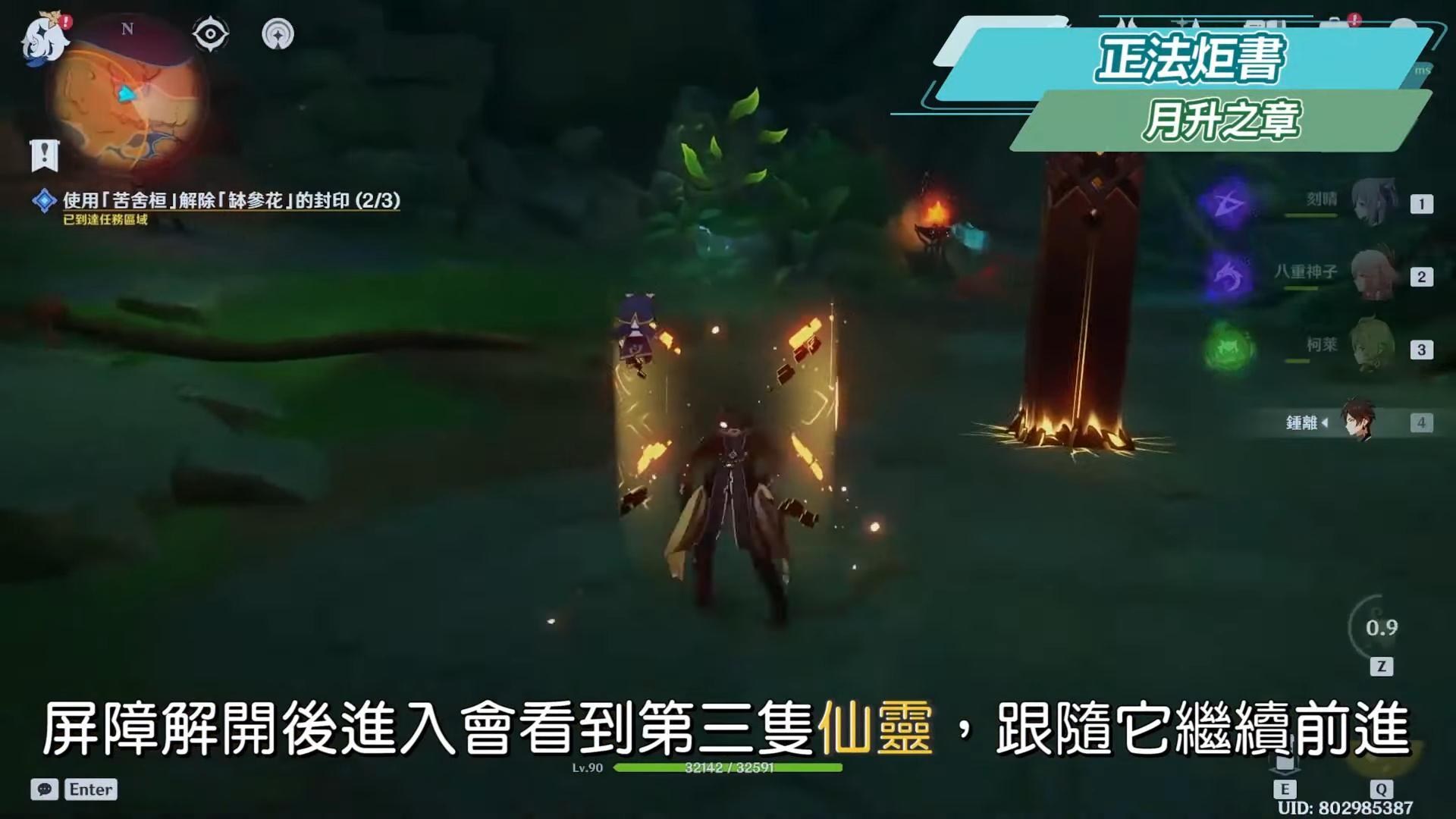 進來洞穴看到左右有兩隻仙靈,任意選擇仙靈從兩條路線跟隨,路上可以注意派蒙的提示使用苦舍桓,一邊解除缽參花的封印,順便把該拿的東西拿一拿,最後解開屏障的兩道封印,屏障解開後進入會看到第三隻仙靈,跟隨它繼續前進。