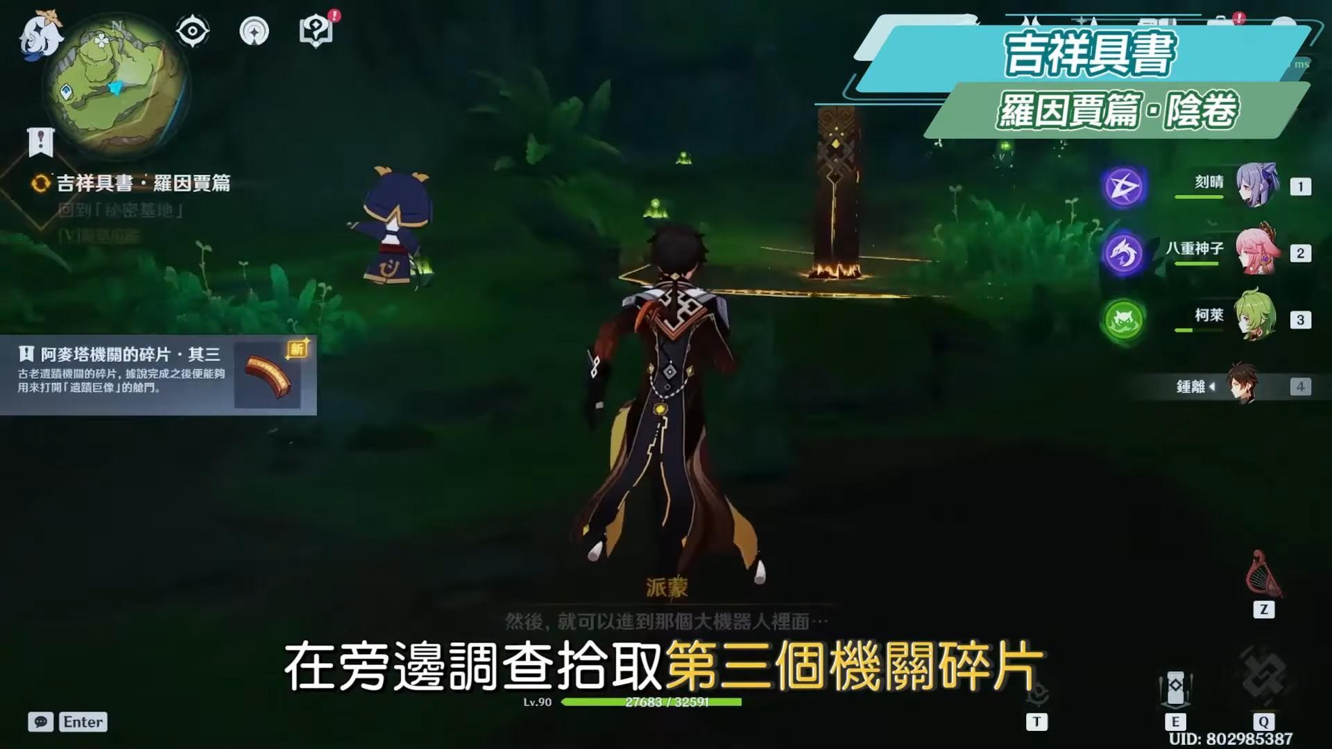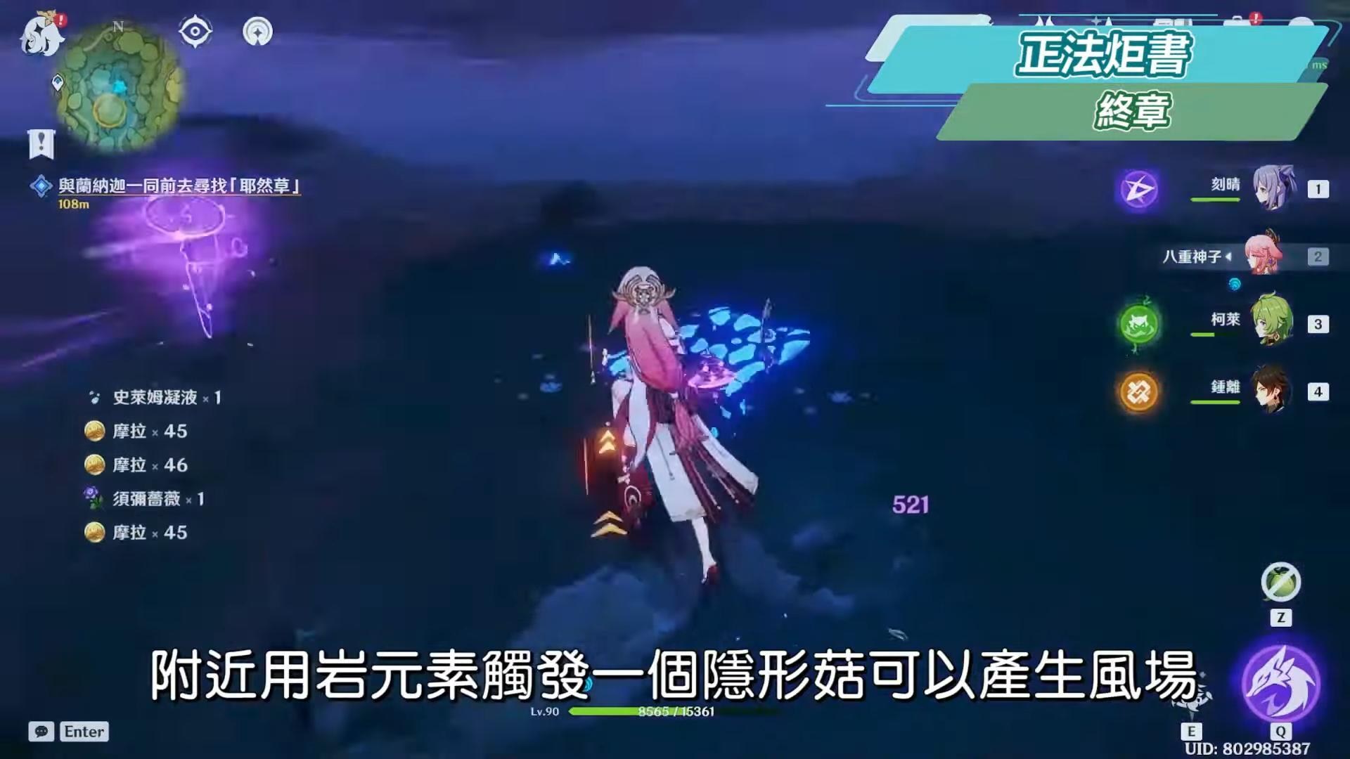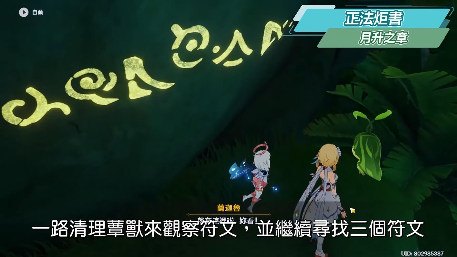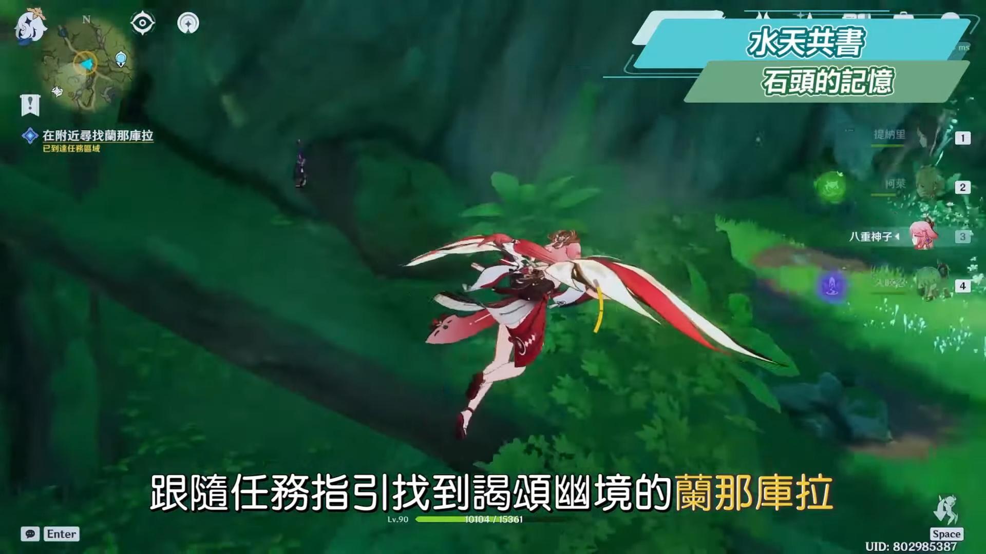到無郁稠林與蘭納迦對話,尋找耶然草,在附近用岩元素觸發一個隱形菇可以產生風場,往上飛,可以順便拿草神瞳,接著解開三處耶然草的封印。