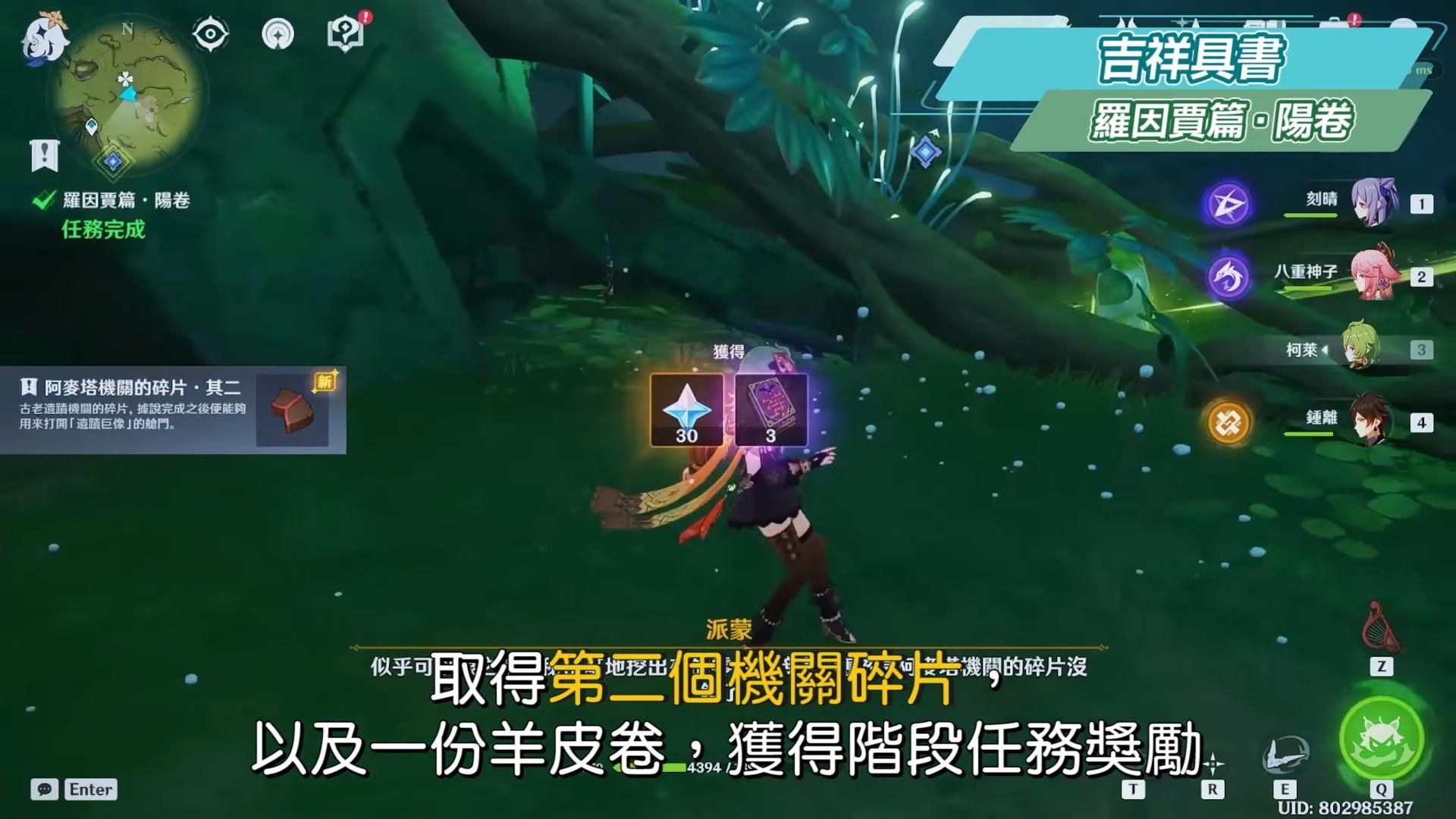 來到下方透過四葉印來到任務指引點,路上有草神瞳,對圓球演奏曲目,解開裡面的草元素方碑封印,並按照綠色痕跡的提示解鎖草元素方碑,使用草種子攻擊旁邊的石門可以拿奇饋寶箱,最後啟動機關使水位下降,取得第二個機關碎片,以及一份羊皮卷,獲得階段任務獎勵。
