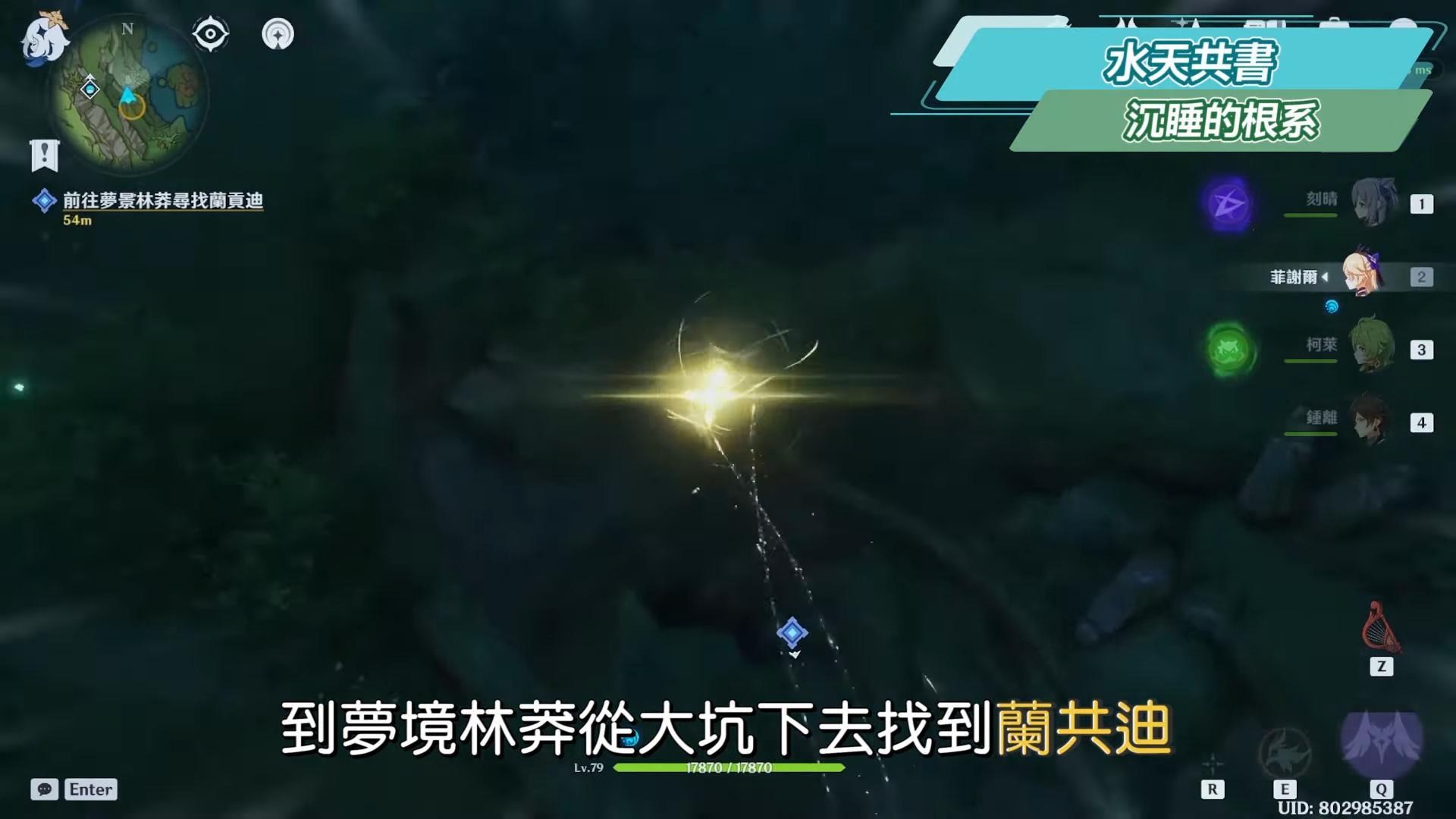 到夢境林莽從大坑下去找到蘭貢迪,在任務指引點彈奏樂曲引出蘭貢迪,用雷元素活化彈跳菇,上去找到枝。