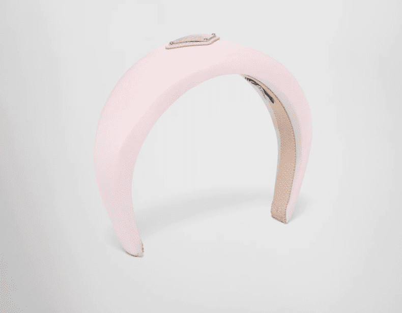 誰能招架的住淺粉紅色的Prada!這款搭配尼龍材質的髮箍不似厚厚的外型,拿上手很輕盈,小浮誇的厚度讓他有十足的份量感,標誌性的Prada倒三角形標誌,非常完美詮釋了80年代的時髦復古!(商店售價:NT$ 16,500)
