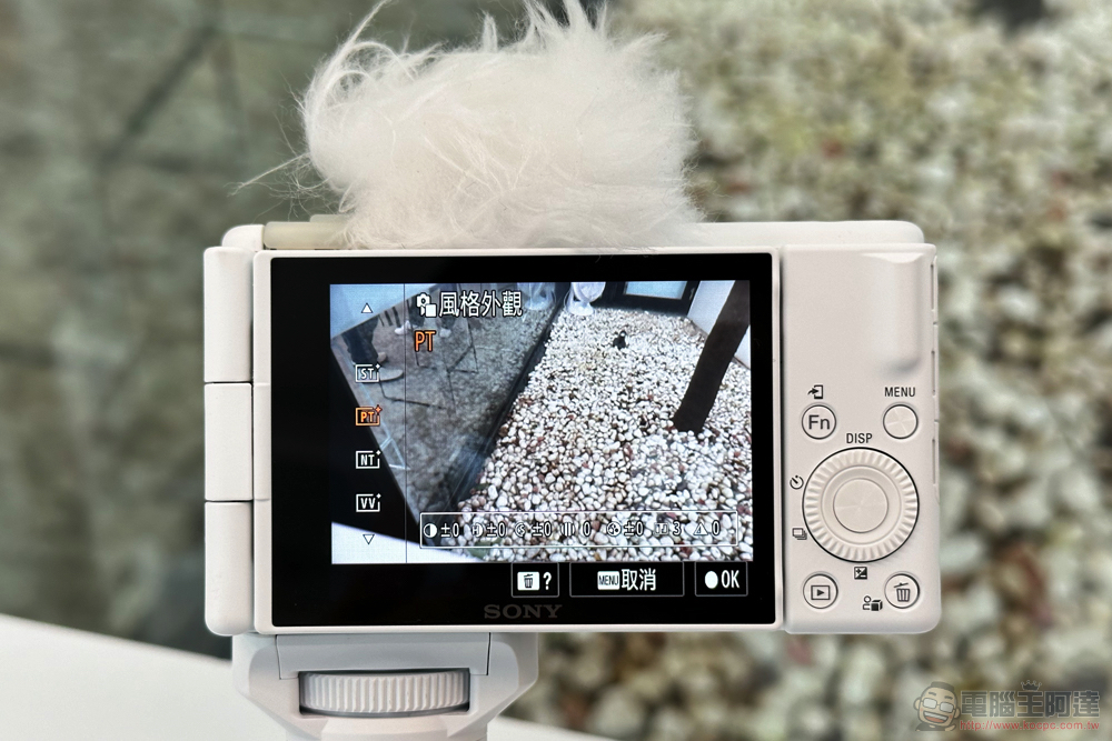 但在拍攝畫面可以支援上滑帶出 FN 選單,還有類似 Canon PowerShot 的觸控控制系統。基本上彌補了 ZV-1F 相對簡潔的操作按鈕的狀況。功能方面,則是還提供了 Creative Look 風格外觀的支援,也可以透過 USB 來當作視訊鏡頭或直播使用。