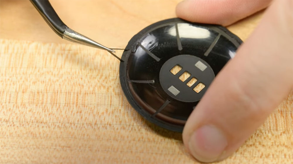 顯示器的連接排線位於電池下方,你必須輕輕撬動才能分離,不過這個動作是相當危險的,因為在緊湊的零件排列中撬開電池很可能會對其他部分造成損壞,而且電池本身還需要一些其他手續並且移除大量零件才能觸及。在機械輸入元件(錶冠和側面按鈕)皆與測試連接口位於同一條纜線上,並且固定連接至外殼,這表示你不用更換卡住的開關(至少不會造成額外的附帶傷害)。