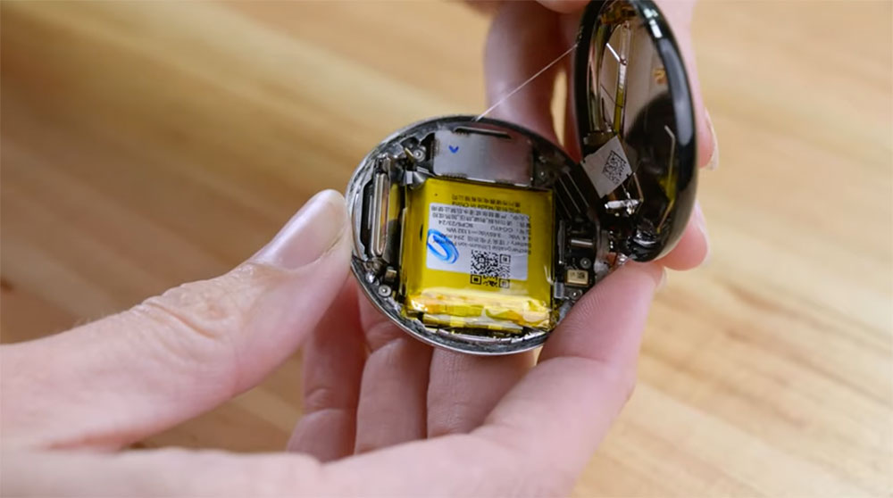 雖然 Pixel Watch 擁有像珠寶般的別緻外觀而受到熱烈討論,但內部卻不像外部那個精緻。iFixit 在拆解時將 Pixel Watch 放在加熱墊上更容易撬開頂蓋。打開手錶即可看到電池,在電池上面似乎覆蓋了淡黃色的 Kapton 膠帶,電池部分則是用很常見的鋁箔袋包裝。