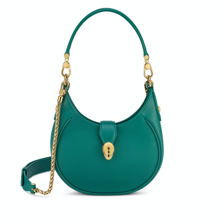 珠寶起家的 Bvlgari,近年來已代表品的蛇頭所設計的包款亦是許多女孩的最愛!這款用祖母綠配色為發想的包款,搭配上金色的蛇頭設計,加上腋下包的半月包型,其奢華又具優雅氣息的風格,不管是出入晚宴,還是一場浪漫的約會都很適合。(商品售價:NTD69,800)