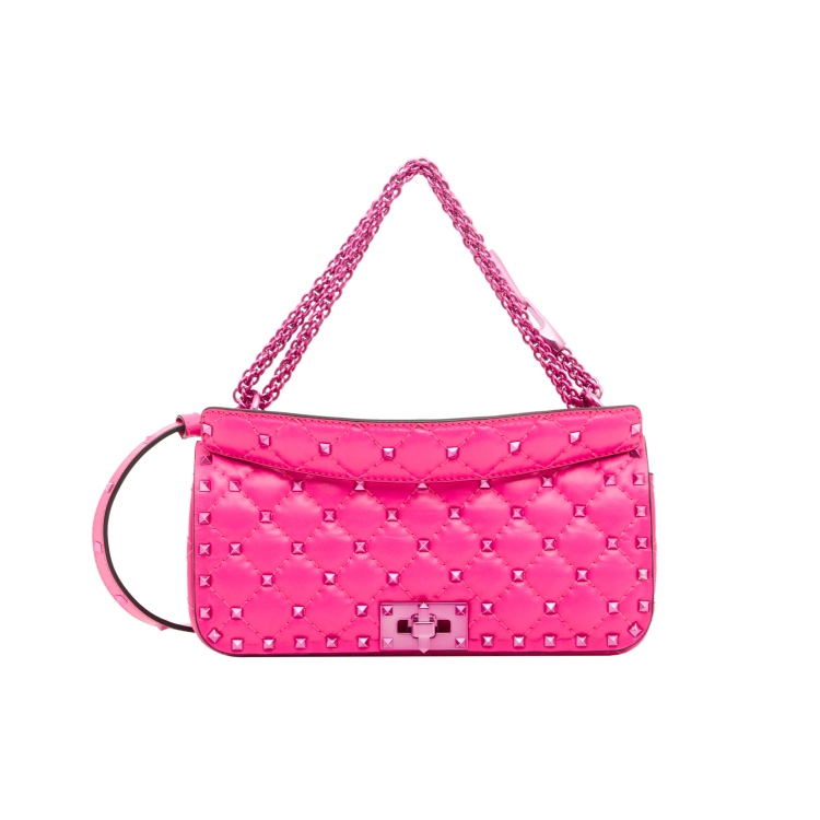 讓時尚圈掀起「芭比粉」風潮的 Valentino,在這款鏈帶肩背小包上,除了以品牌本季的 PP Pink 為主色調外,更將標誌性的鉚釘運用於其中,別具風格的設計,讓妳的目光無法移開。(商品售價:NTD96,500)