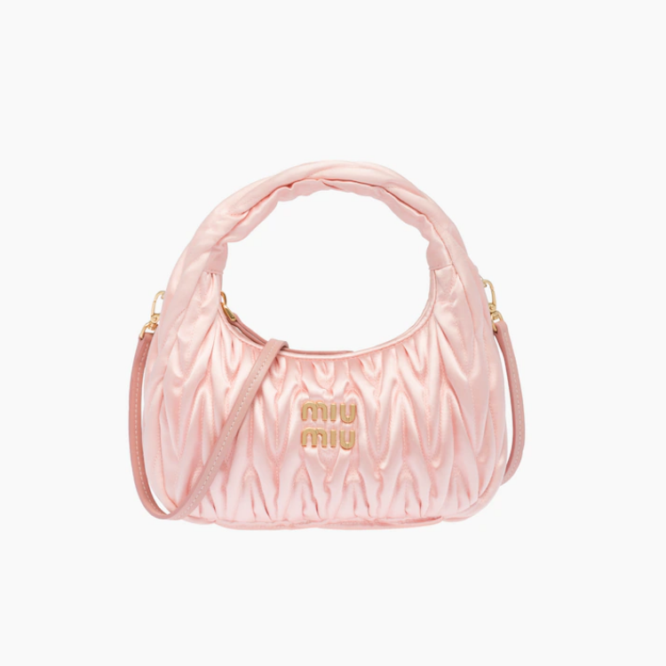 MiuMiu 身為精品界的可愛教主,在包款的設計上總能甜到像吃糖!這款「Miu Wander」手提機背包,運用綢緞為面料,搭配上經典的抓皺衍縫設計,讓整款包充滿浪漫的氣息。(商品售價:NTD60,000)