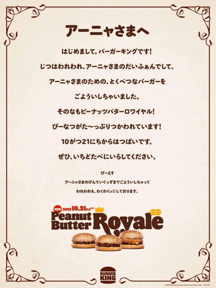 這次聯名企劃的預告也讓人留下了很深刻的印象!不是使用一般常見的商品宣傳海報,而是一封「寫給安妮亞大人的信」!漢堡王先說明自己是安妮亞大人的超級粉絲,特別為了她推出花生醬口味的漢堡,並以誠摯的心,邀請安妮亞大人來品嘗「Peanut Butter Royale(皇家花生醬)」漢堡,裡頭加上了滿滿的花生醬,身為「花生控」的安妮亞肯定直衝門市了吧(笑)。