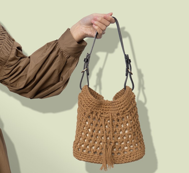 真皮手提棉質繩編織鏤空水桶包使用真皮手提材質耐用、可拆卸、可調節長短,甚至你還可以搭配不同的包款一起使用,相當的多功能。設計師很貼心的在底部加了鉚釘設計,讓你包包隨便亂放也不容易髒掉。水桶包看起來相當的時尚,加上裡頭大容量的收納空間設計,讓整體質感與實用性兼具。