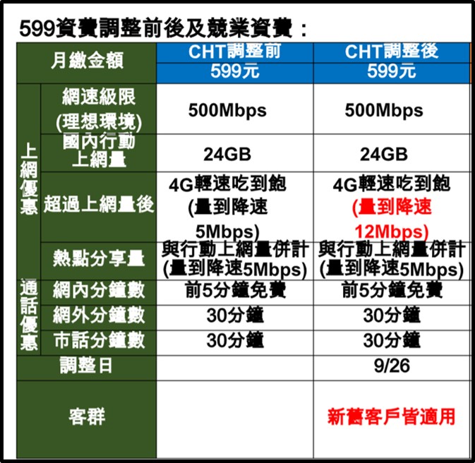 中華電信9月26日跟進其他業者推出5G 599超量降速升級為12Mbps方案,不過根據通路流出的中華官方通告,中華電信是目前業者唯一不論新舊用戶都可以適用的。