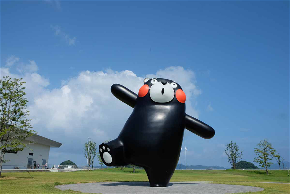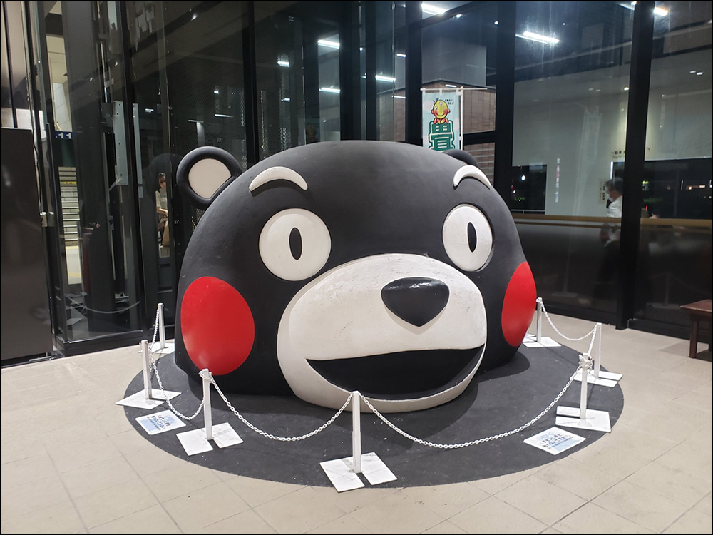 至於要前往熊本,許多人不會選擇直接直飛熊本,而是先前往福岡,順便玩玩北九州的各大城市與景點,像是從博多站搭乘新幹線只花 39 分鐘就能到熊本來個單日觀光行程。不過呢,只要抵達熊本車站就會看到這尊熊本熊部長的大頭。