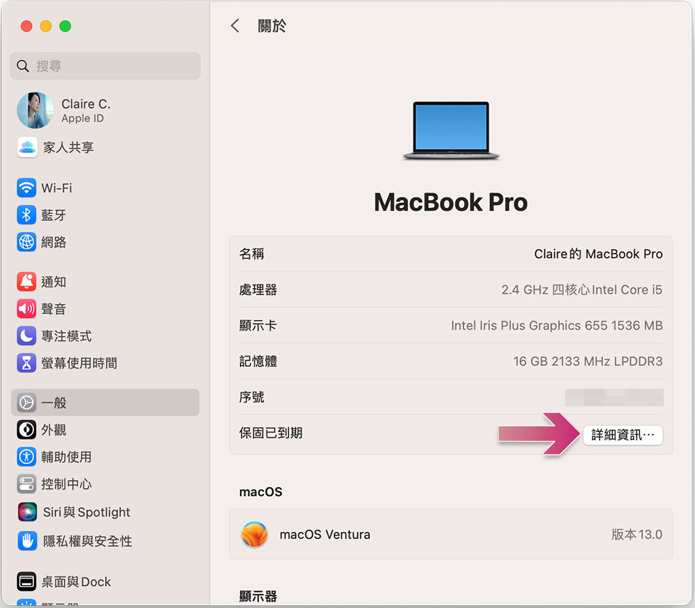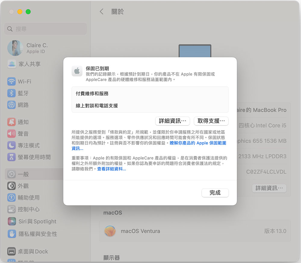 在 macOS Monterey 與更舊的系統版本中,你可以點擊控制列最左側的 Apple 標誌,然後選擇「關於這台 Mac」,並且切換到「支援」分頁中獲取手上這部 Mac 的保固相關資訊。而在 macOS Ventura 裡面雖說仍然可以在「關於這台 Mac」裡找到,不過卻不是很明顯。更快速的取得方法,則可以依照下方的方式: