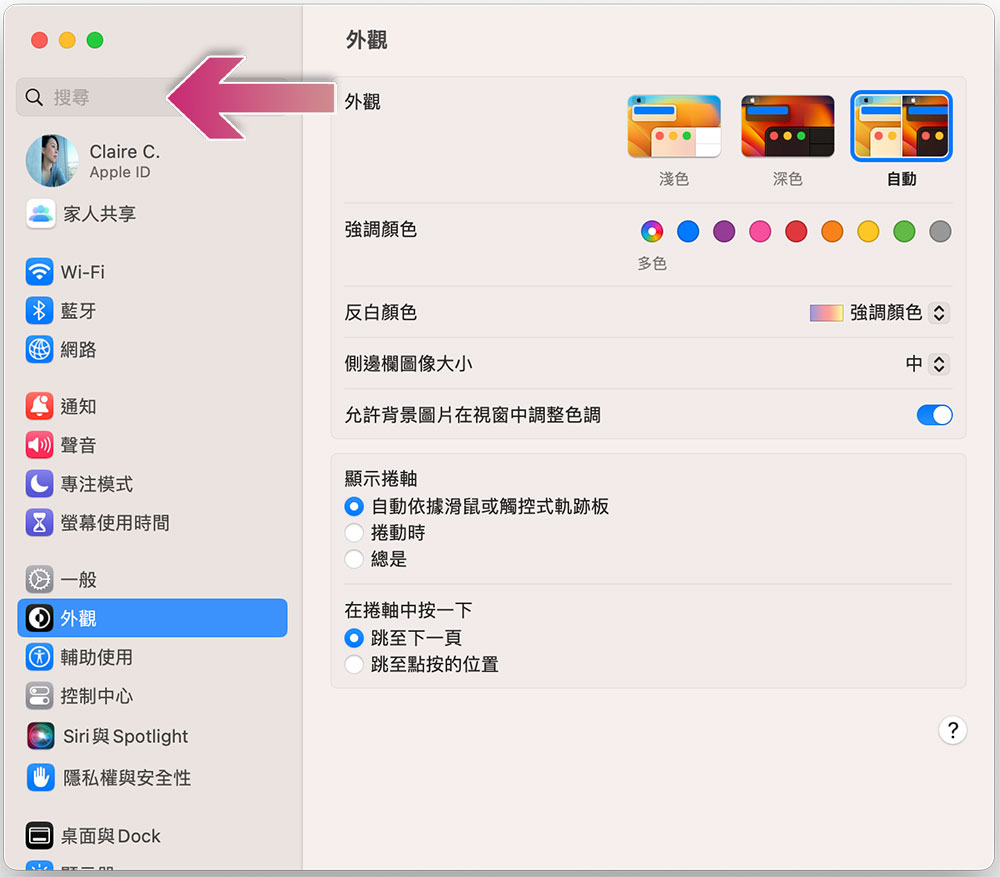 ★在開始之前,有個重點跟大家說明一下。雖然在系統設定裡面提供「搜尋」,但有時你用的關鍵字與 macOS 所認為的並不相符,所以查找時可能會有點困難,不過這項功能還是很有幫助。