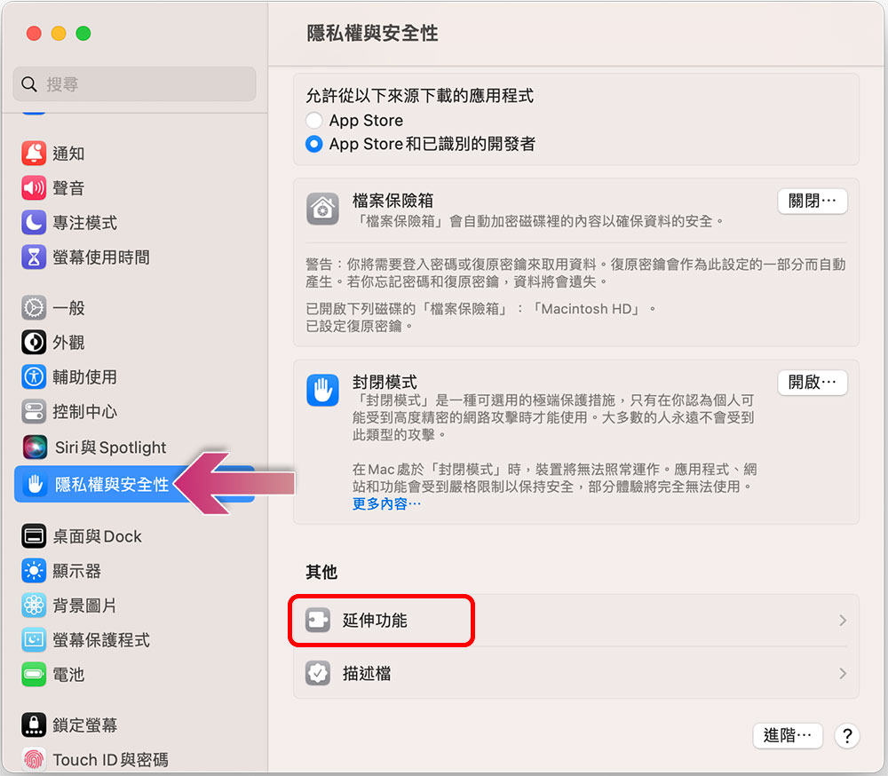 在 macOS Monterey 以前版本的系統,你可以從系統偏好設定中點擊獨立出來的「延伸功能」來為 Mac 加入系統範圍的功能,通常會是在安裝應用程式時進行。但在 macOS Ventura 中則將它放到「隱私權與安全性」中,沒逐項去翻還蠻難找到的。打開「系統設定」,點擊側邊欄上的「隱私權與安全性」,捲到主設定區塊最下方的「其他」即可看到「延伸功能」。