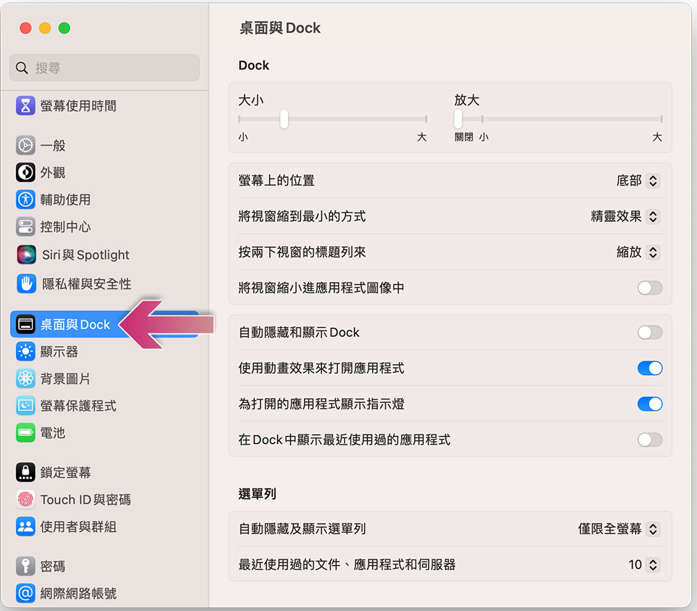 - 進入「系統設定」,在側邊欄中點擊「桌面與 Dock」。