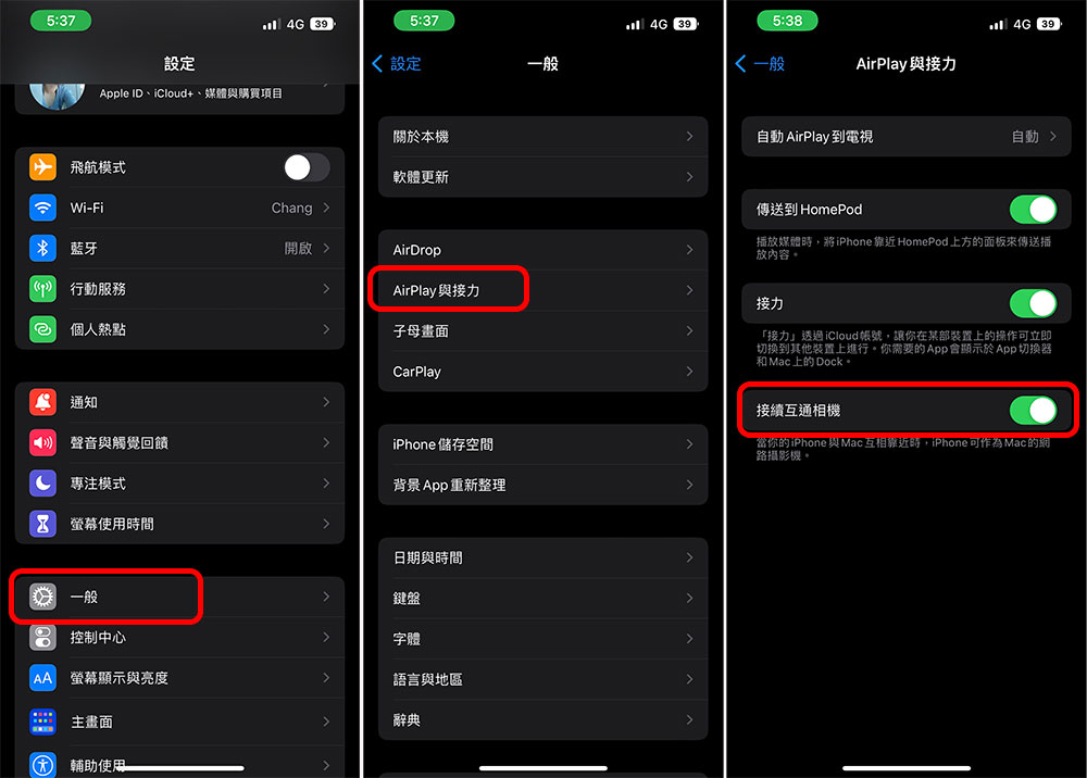 第一步我們先將 iPhone 裡面的「接續互通相機」功能啟用。請打開手機上的「設定」,進入「一般」後點擊「AirPlay 與接力」,然後把「接續互通相機」的開關打開。