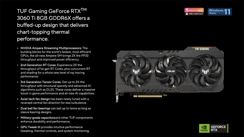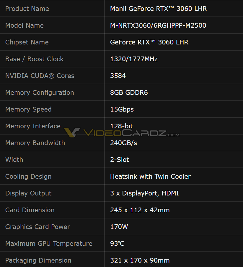 最近國外 Manli 和台灣的華碩相繼推出 GeForce RTX 3060 8GB 顯示卡,這張搭載的圖形處理器應該是跟 12GB 版本一樣,也就是 GA106,具有 3584 個 CUDA 核心和 1777MHz 超頻時脈。TBP 額定功耗也是 170W,採用雙冷卻系統和四個顯示輸出,分別為 3 個 DisplayPort 1.4 和 1 個 HDMI 2.0。