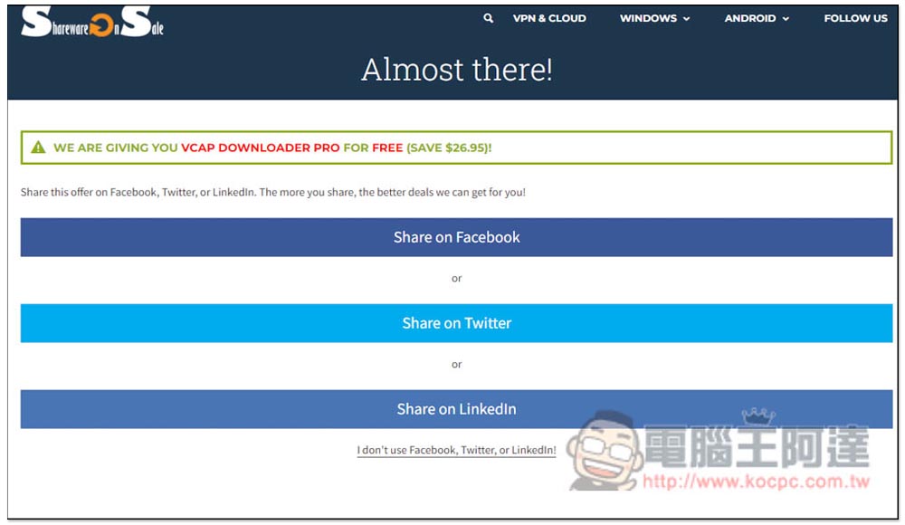 接著會要求分享到 Facebook、Twitter 或 Linkedln,不想分享的人點最下方 I don't use Facebook, Twitter, or Linkedln!: