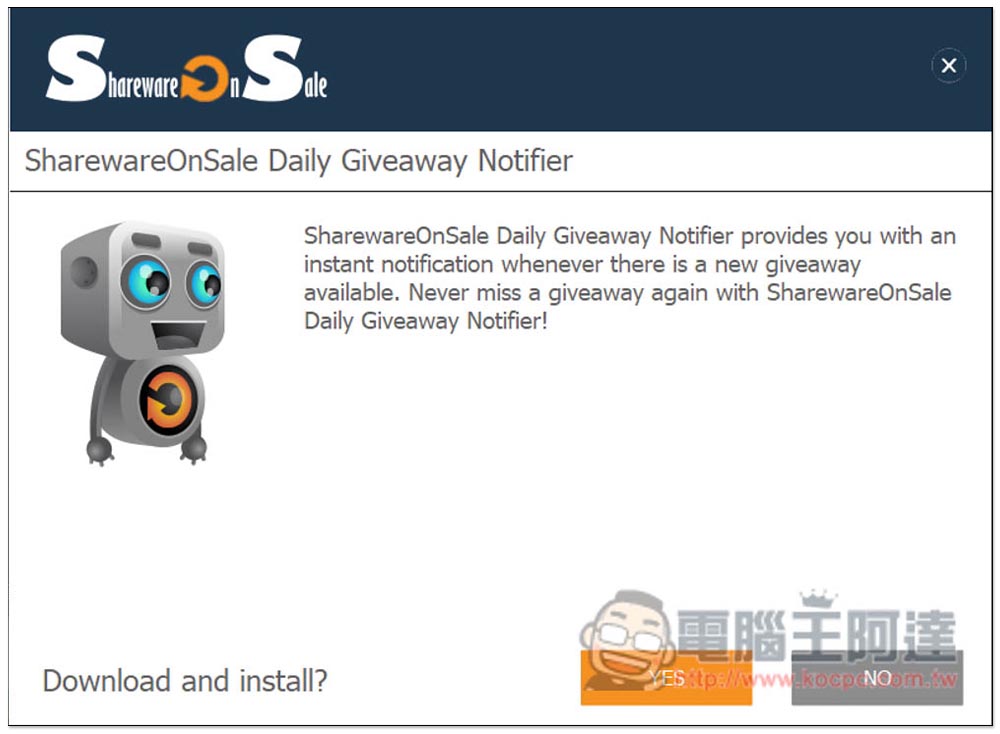這一個是問你要不要安裝 SharewareOnSale Daily Giveaway 限免資訊的通知,不想要就按 NO:
