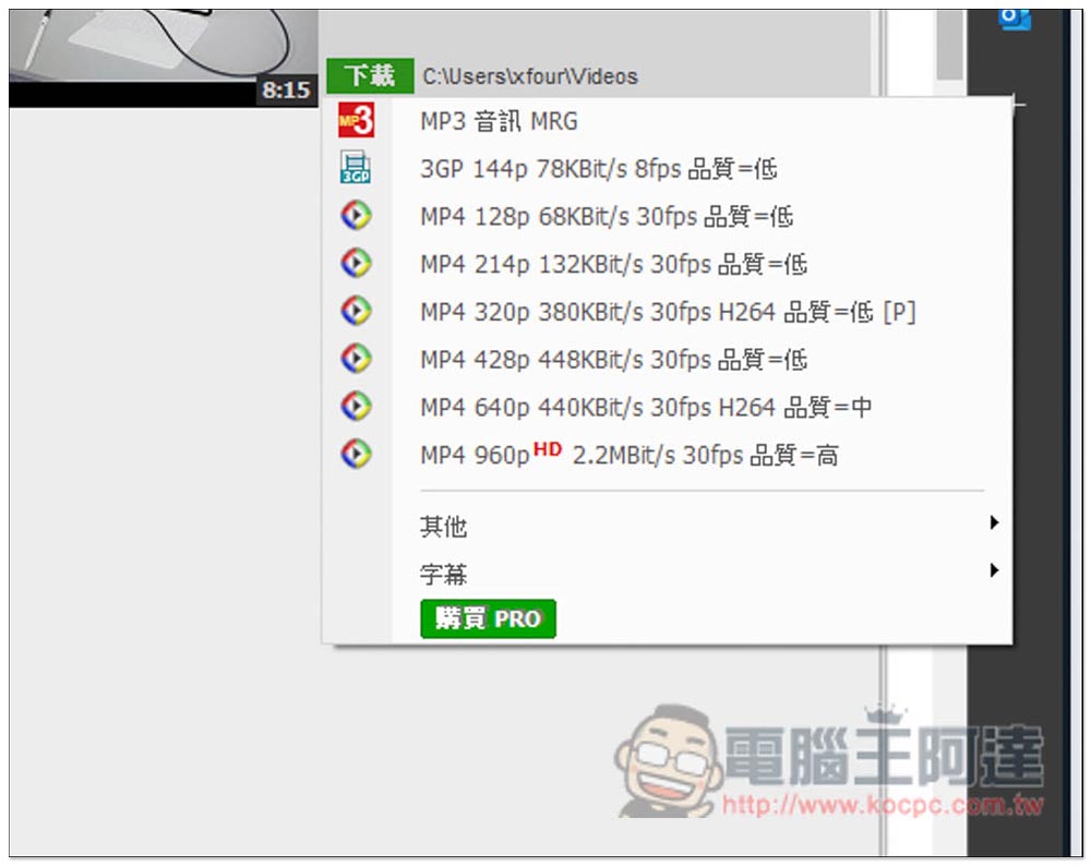 點擊下載,就能選擇要的格式,YouTube 部分比較奇怪,我截圖的這部影片最高僅支援 1080P MP4,但我有找到幾部是有支援到 4K 畫質。也能下載 MP3 音樂: