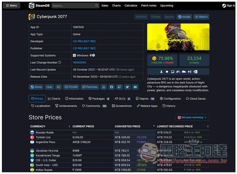 SteamDB 這兩個網站之中,我最推薦的一個,它就專門收集 Steam 遊戲資料庫,基本上每一款遊戲都能找到,而且似乎沒有任何廣告,也提供免費註冊帳號功能,讓你可以將喜歡的遊戲收藏起來,方便未來隨時追蹤。
