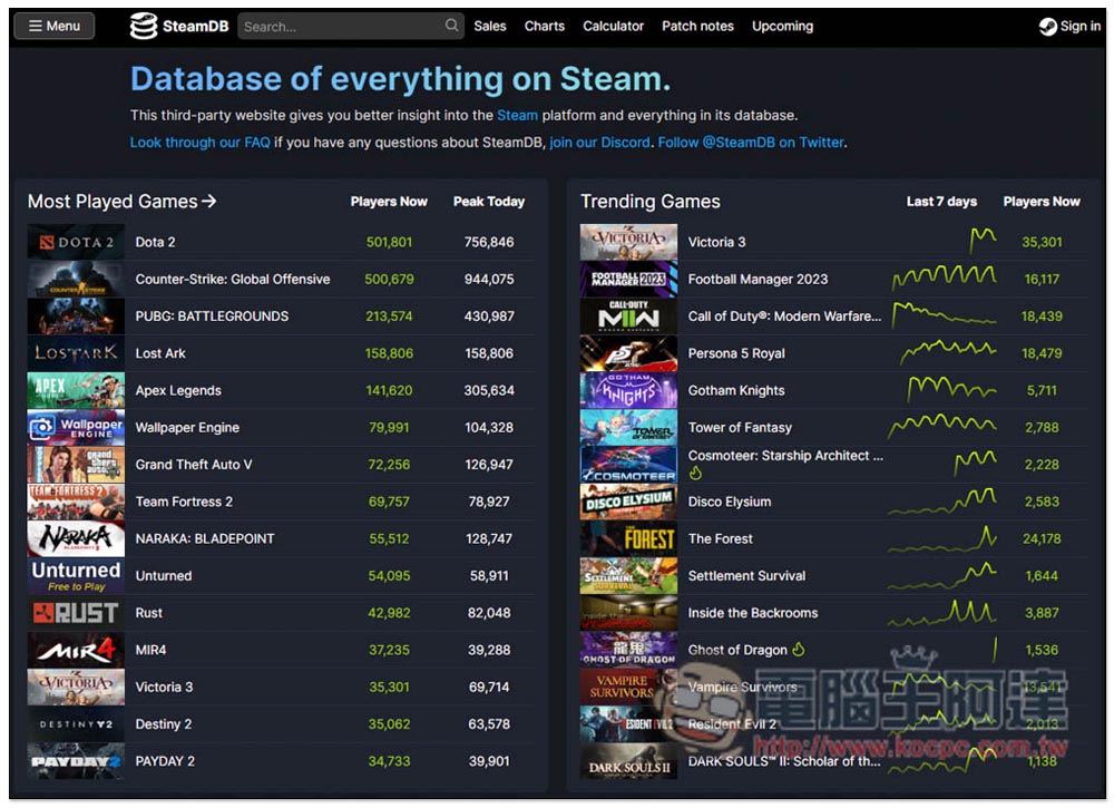 首頁也會告訴你哪些遊戲現在最熱門、最多人玩、剛上市沒多久、甚至是每個 Steam 促銷活動,幾乎可以說所有有關於 Steam,這網站都能找到相關資訊。