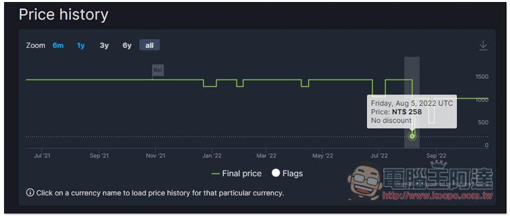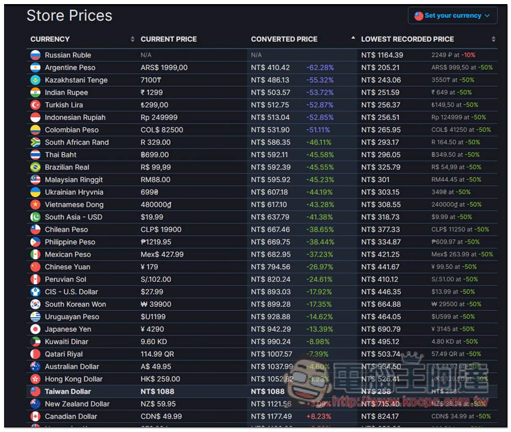往下滑即可找到各國 Steam 的價格,當前、匯率轉換之後的價格差距、以及最低價資訊都有,如果你想要看台灣 Steam 價格變化的話,就點擊 Taiwan Dollar 那個欄位: