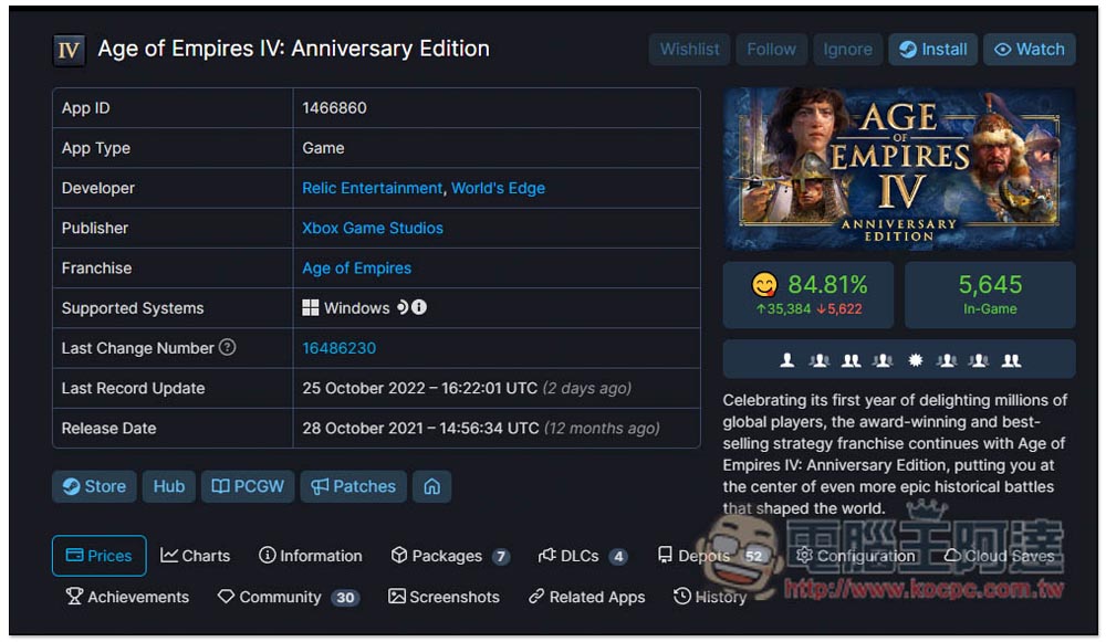 以 Age of Empires IV 世紀帝國四為例,進到內頁之後,最上方會先顯示一些遊戲資訊,包括哪間公司推出、支援什麼作業系統、上市時間、最新更新時間: