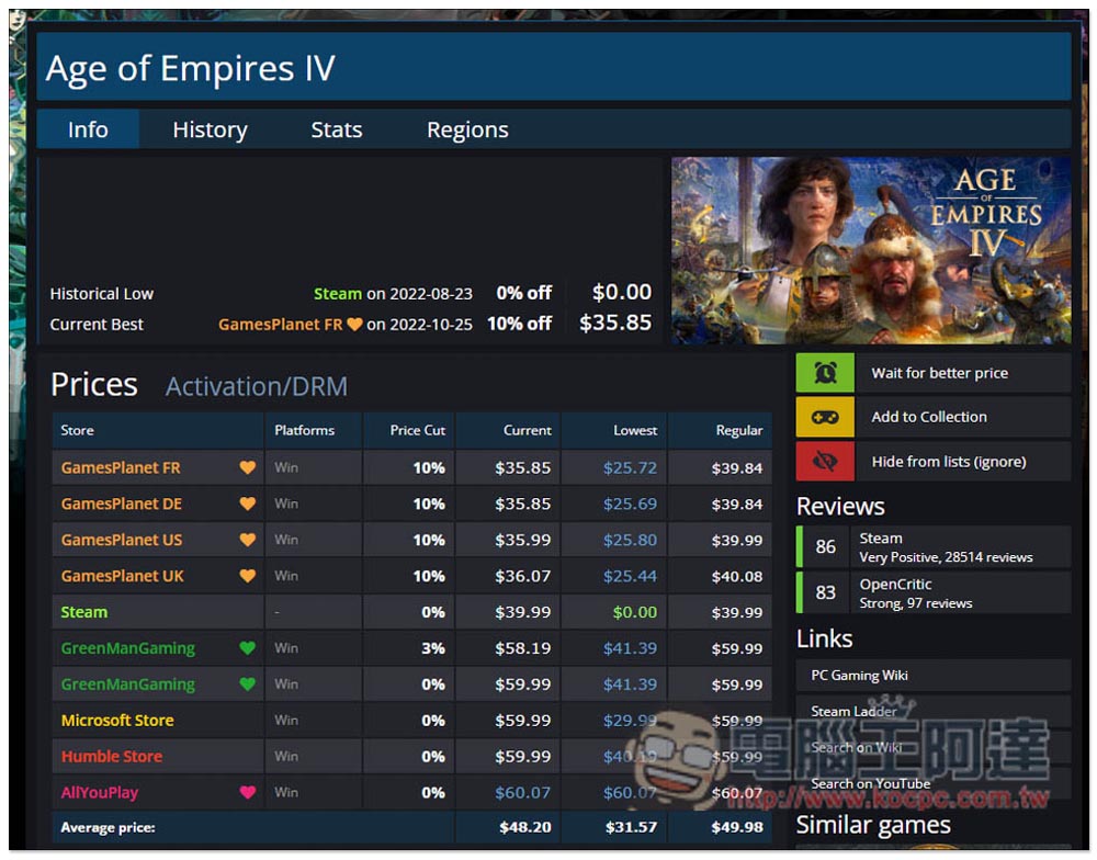 Age of Empires IV 世紀帝國四不少平台的價格資訊都有,以 Steam 目前來說,並不是最便宜的。另外 Steam 遊戲價格資訊也只有美國,跟台灣 Steam 會不太一樣,比較時建議手動打開台灣 Steam 遊戲頁面會更準確: