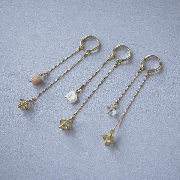 耳骨夾可說是這一兩年來最具話題的時尚單品,不僅沒有耳洞的人能輕鬆佩戴,本身已有耳洞的人也能透過耳骨夾提升整體造型的層次感。鹿角兔推出此款採用前後垂吊設計的耳骨夾,一邊是多芒星鋯石墜,一邊則是不規則的太陽石,搭配上無電鍍的黃酮材質,呈現復古優雅氣息。
